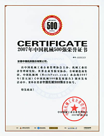 2007年《中國機械500強》暨《世界機械500強》發(fā)展報告會7月20在北京人民大會堂隆重舉行,我公司榮獲“中國機械